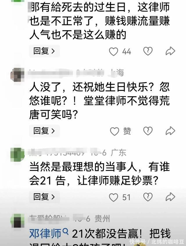 更让人哭笑不得的是邓高静律师的表演,她给大S送上生日祝福时,还不忘标榜这是"律师最理想的当事人",这话说得实在露骨,连网友都看不下去,直接吐槽:"这钱实在太好赚了"。